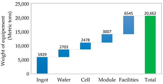 The site dimensioning considers the required equipment footprints, consumables storage space, logistics and services operations, utilities, and building and facilities requirements. The main material flows that take place along the site are of water, wastewater, PV modules, solar glass, aluminum frames, module packaging materials, encapsulants, backsheets, polysilicon chunks and crucibles. A storage capacity of 30 days is considered for consumables and final products, with 24 h storage defined for municipal water. An electrical substation of 100 MVA is placed on site. In total, for the 5 GWp/a polysilicon to module production facility, 3467 process equipment tools have been quantified for the 4 factories and 1070 facilities equipment tools for the facilities of the industrial site. The weights of the equipment per factory and facilities are reported in Figure 3. The facilities and Si-ingot factory represent almost a third each from the total equipment weights. The highest total weight of the process equipment comes from the Cz pullers, the PV module laminators, and the furnaces for the solar cell passivation steps. The highest total weight of the facilities equipment belongs to the heating, ventilation, and air-conditioning (HVAC) system and the effluent treatment plant (EFP). See Appendix A for more details.