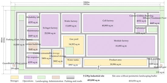 The industrial site is dimensioned to produce 25,902 metric tons/a of Cz-ingots, 24,631,830 m2/a wafers, 23,678,425 m2/a PERC solar cells and 25,500,741 m2/a PV modules—bifacial selective emitter 60-cell p-type M2 Cz PERC glass and backsheet modules with an aluminum frame—, which are equivalent to an aligned module factory output of 5 GWp/a. The reference products and process sequence with 35 processes defined by Brailovsky et al. (2023) [] have been considered.