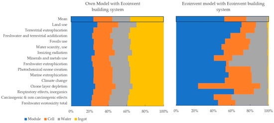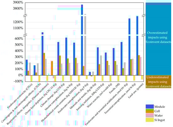 The resulting are reported in Table 3. The percentual differences are visualized in Figure 5. For the wafer, cell, and module factories, the EI annualized environmental impacts are strongly overestimated for most impact categories, which reflects the technology and productivity evolution over the last two decades, both in terms of the process equipment capacities and the construction techniques. For the categories freshwater and terrestrial eutrophication, land use and respiratory effects, overestimations of more than one order of magnitude are found for the module factory, which is also observed for the wafer factory freshwater eutrophication.