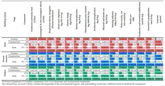 From the results reported for the industrial site environmental impacts , the high relevance of the product stage for the equipment (PE and FE), steel, concrete and insulation material manufacturing should be highlighted. For the equipment, the relevance of the copper-mining impacts is to be emphasized; further research should explore the representativeness and up-to-dateness of the “metal working machine” and “copper, cathode” datasets for diverse industries to avoid associated limitations. The refining of copper and steel and the production of concrete are strongly influenced by the electricity and fuel mix, and by the shares of primary and secondary materials (recycling content) at the production sites. The proposed structural timber framing system helps to significantly reduce the environmental impacts of the CSA components. The use of environmentally friendly cladding insulation materials should also be considered.