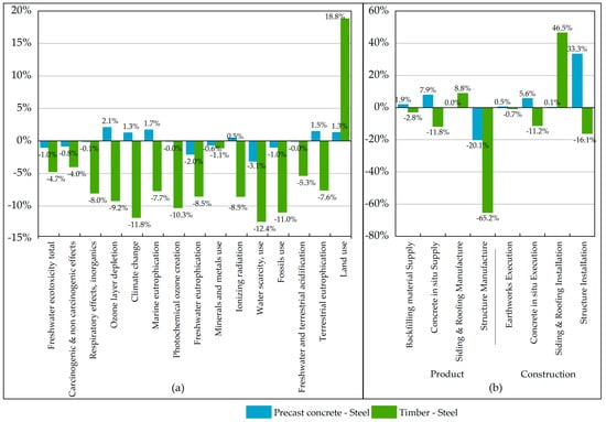 The median differences per construction components in Figure 8b reflect the specific levers of the impact changes. The structural timber system impacts have important reductions in the structure and concrete in situ supply and execution. The concrete and backfilling materials requirements are smaller as the underground components’ dimensions are adapted to the lighter above-ground structure. For the precast concrete system, the impacts shift due to a higher usage of concrete and lower use of steel.