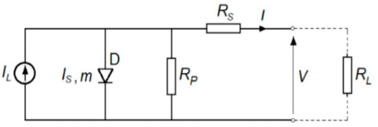In describing the operation of a PV module, most mathematical models are rooted in Shockley’s theory of the illuminated p–n junction [4]. Among these models, the one-diode model stands out due to its apparent simplicity. Based on the one-diode model equivalent circuit from Figure 1, the most widely used equation for the I–V characteristic of a solar cell is: