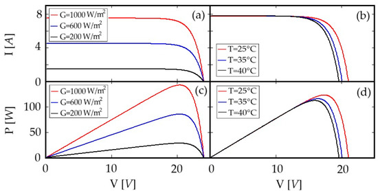 I–V and P–V characteristics of a solar module under varying (a,c) solar irradiance and (b,d) cell temperature.