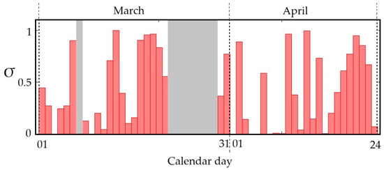 Relative sunshine, , for all the 46 test days. The shaded areas denote missing data: 7th of March (incomplete) and 22nd–29th of March (system stopped).