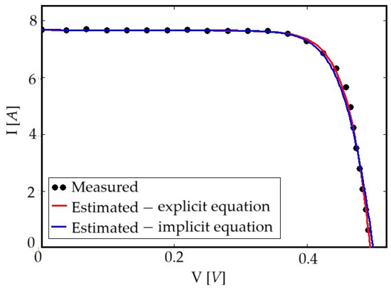 Figure 5 illustrates the I–V characteristics at STC for the Cleversolar SPR-135 PV module, evaluated with the implicit (Equation (1)) and explicit (Equation (5)) equations. The equation parameters were estimated with the SDA in the same computational framework. The overlap between the measured and estimated I–V characteristic is remarkably close.