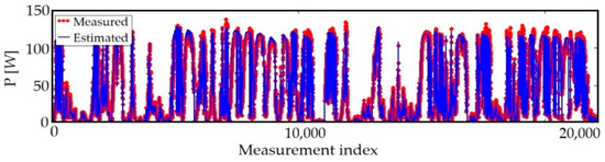 Figure 6 illustrates a comparison between the estimated and measured output power delivered by the PV system during the test days. Notably, the estimated power replicates the measured power with reasonable accuracy. There can be seen to be a very good overlap between the values, although slight differences can be observed for higher values. The normalized mean bias error nMBE calculated for the dataset is only 4.8%. nMBE is defined as , where e and m denote the estimated and measured quantities, respectively. This test validates the model for further applications. From the running time perspective, using the explicit equation (Equation (5)) reduces the running time by two-thirds compared to the implicit equation (Equation (1)). For example, the running time decreases from 4.3 s to 1.3 s in the case of estimating the output power delivered by the PV system during the 46 test days.