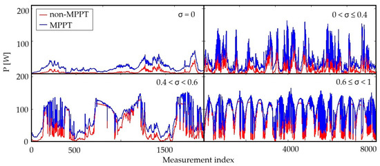In this section we present the results of the comparison of the power delivered by the PV system in the test days, assuming the presence and the absence of MPPT. On the Solar Platform, the PV system is used for testing PV power models; thus, the PV modules are connected directly to a resistive load, without an MPPT system. The presence of MPPT was simulated with our explicit model. The dataset was divided into four distinct classes based on relative sunshine levels. More specifically, (5 days), meaning no sunshine during the day; (20 days) and (4 days), representing varying degrees of cloud cover during the day; and (17 days), meaning a lower cloud coverage with longer periods of sunshine.