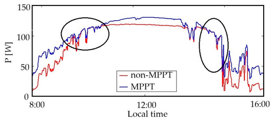 Figure 7 graphically compares the measured power (in the absence of MPPT) with the estimated power in the presence of MPPT. The results highlight the effectiveness of MPPT, especially during overcast conditions. As can be seen in Table 3, in overcast conditions the implementation of MPPT technologies demonstrates a potential to extract an additional 77% of the available power on a pure resistive load. Moreover, considering the characteristics of the dataset (spring days, with colder temperatures), it is evident that MPPT substantially reduces losses, particularly in scenarios featuring both lower temperatures and high cloud coverage. In instances of low cloud coverage throughout the day, the losses covered by MPPT are only 13%. There are two significant moments during a day when the output power obtained with both a fixed resistive load and MPPT overlap, one preceding and one following midday, as depicted in Figure 8. Besides those two moments, the load line never intersects the I–V characteristic in the MPP. Figure 8 presents a randomly selected day from the database for illustrative purposes, the observed behavior being consistent across all days.