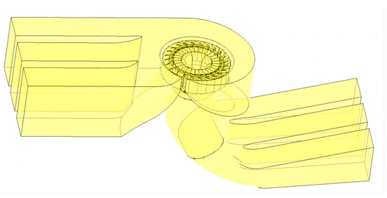 A certain type of Kaplan turbine is composed of five flow components, namely, a spiral casing, stay vane, guide vane, runner and draft tube. The calculation domain model of the turbine is shown in Figure 1, and each calculation subdomain is connected through the interface. The spiral casing calculation subdomain is shown in Figure 2a, and the draft tube is shown in Figure 2b, which has three piers. The runner, as shown in Figure 2c, consists of a hub body, blades and a drain cone. The stay vane and guide vane are shown in Figure 2d.