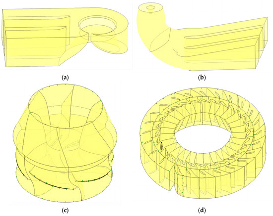 Computational subdomain models: (a) Spiral casing; (b) Draft tube; (c) Runner; (d) Stay vane and guide vane.