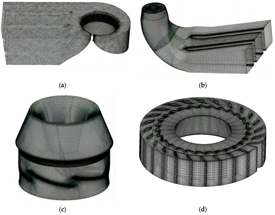 Grid division of computing domain: (a) Spiral casing; (b) Draft tube; (c) Runner; (d) Stay vane and guide vane.