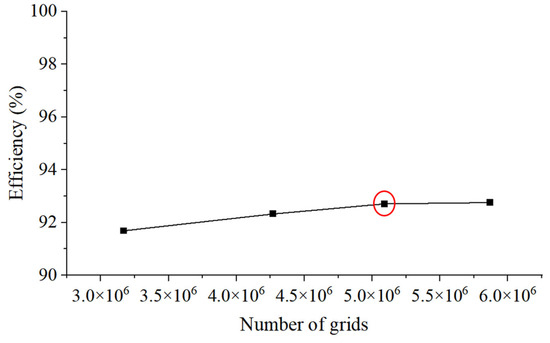 The fine mesh division can improve the calculation accuracy. However, too many grids will lead to too high a calculation cost, so it is necessary to choose an appropriate grid division method and grid number in engineering practice. As shown in Figure 4, four sets of grids are divided into rated working conditions, and the efficiency of the turbine under the different division schemes is compared. After the number of grids exceeds 5 million, the efficiency gradually levels off. The difference between the number of the third set of grids and the fourth set of grids is about 7.8 × 105, but the difference in efficiency is only 0.05%. Considering computer performance and time cost, the third grid is selected for subsequent calculations, and the wall y+ value is less than 300.