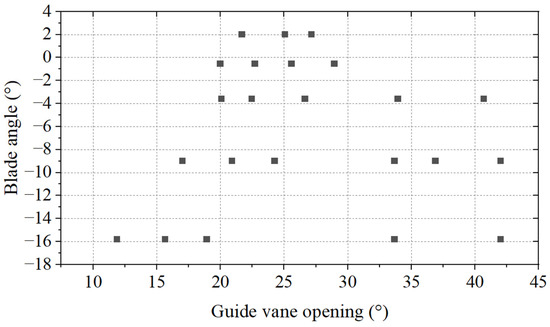 According to the off-cam working conditions selected in the field experiment, the guide vane opening is changed under 5 blade angles (β = −0.55°, 2°, −3.6°, −9°, −15.8°), and a total of 25 working conditions are calculated. In the safe operation zone of the Kaplan turbine, different combinations of guide blade opening and blade angle are selected. When the blade angle is constant, 4–8 different openings are selected for the experiment. And a total of 7 blade angles were selected during the experiment. The relationship between the blade and movable guide vane is shown in Figure 5. When β = −9°, the efficiency of 4 calculation conditions and test conditions are compared, as shown in Table 2. The error is less than 1%, which proves the accuracy of the calculation model.