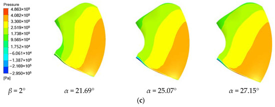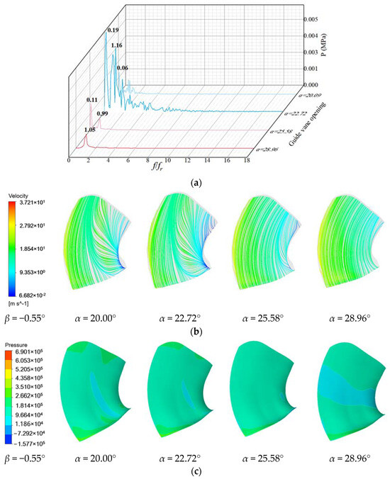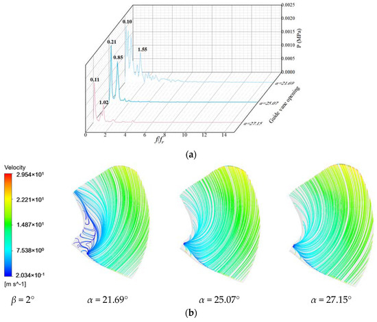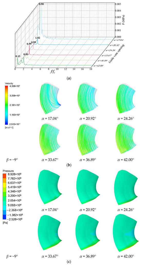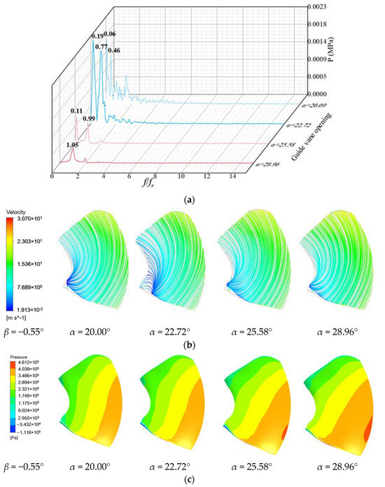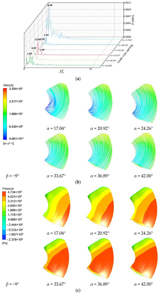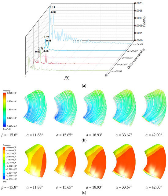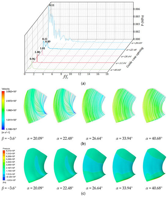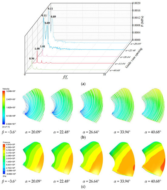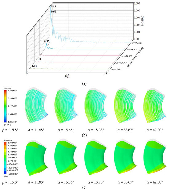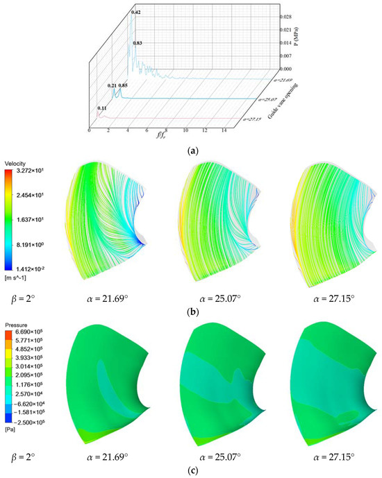 As shown in Figure 6a and Figure 7a, when β = 2°, the amplitude of the pressure pulsation on the high-pressure edge and low-pressure edge of the blade decreases with the increase in the opening; when α = 21.69°, the low-frequency and high-amplitude pressure pulsation on the high-pressure edge and low-pressure edge changes sharply. After the opening is increased to 25.07°, the amplitude change in pressure pulsation is most obvious only at the main frequency and the secondary frequency. As shown in Figure 6b and Figure 7b, the streamlines of the high-pressure and low-pressure sides of the blades also tend to be smooth with the increase in the opening, mainly because the streamlines near the hub change from disordered to smooth. As shown in Figure 6c and Figure 7c, the pressure from the high-pressure edge hub to the rim gradually increases, and the high-pressure area near the rim increases with the increase in the opening. The pressure at the low-pressure edge of the blade changes little, and the low-pressure area near the rim increases with the increase in the opening.