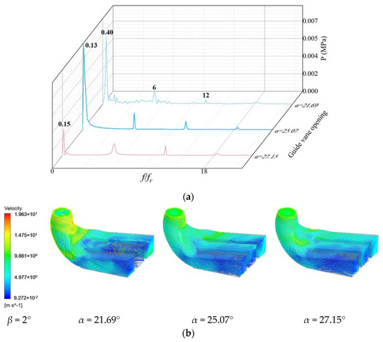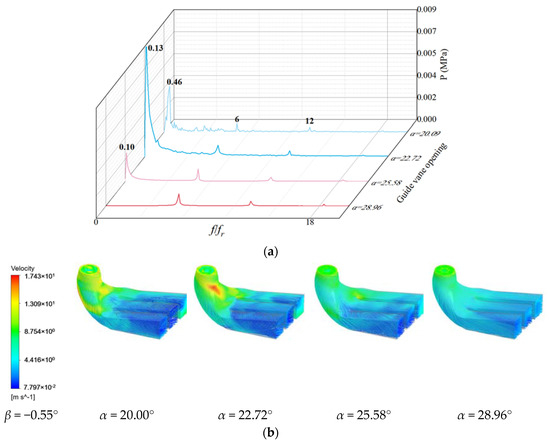 As shown in Figure 16, the pressure pulsation under the condition β = 2° is characterized by low frequency and high amplitude, and approximate low-frequency components are also found in the calculation results of the pressure pulsation at the high- and low-pressure sides of the runner blade. This indicates that the low-frequency pressure pulsation caused by the formation of the low-pressure vortex zone in the draft tube causes the low-frequency pulsation when it propagates to the upstream flow channel, and this low-frequency pulsation is one of the main pulsation sources of pressure pulsation in the turbine. The sub-frequency of the pressure pulsation under the three opening degrees is 6 times and 12 times the rotation frequency, that is, 1 time the blade overflow frequency and 2 times the blade frequency (second harmonic), which is generated by the wake flow of the blade periodically passing through the space fixed point. At α = 25.07° and α = 27.15°, water flows into the inlet of the draft tube after rotating by the runner. The velocity of the water flow at the circumference of the inlet of the draft tube is larger at α = 21.69°, and the flow line in the diffusion section of the draft tube is the most disordered. As shown in Figure 17, when β = −0.55° and α = 22.72°, the amplitude is highest, at 0.13 times the frequency of rotation, and the velocity of the draft tube elbow section is larger.