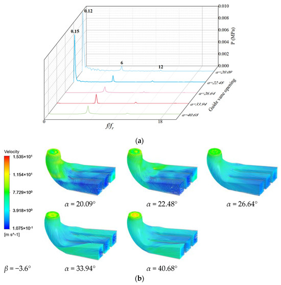 Pressure pulsation and streamline of low-pressure edge of draft tube with blade angle β = −3.6°: (a) Pressure pulsation frequency domain; (b) Streamline.