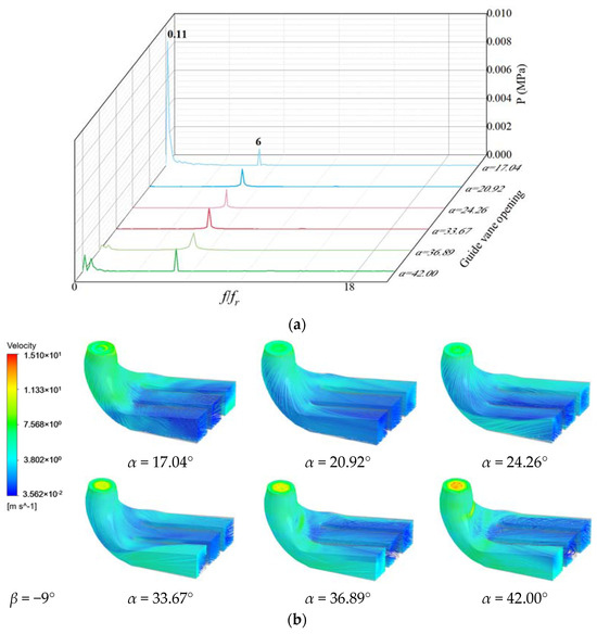 Pressure pulsation and streamline of low-pressure edge of draft tube with blade angle β = −9°: (a) Pressure pulsation frequency domain; (b) Streamline.