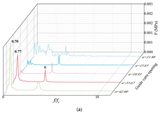 As shown in Figure 18, when β = −3.6°, the flow line is relatively smooth, and there are low-frequency and high-amplitude pressure pulsations at α = 20.09° and α = 22.48°, and the sub-frequency pressure pulsations are 6 times and 12 times. When α = 26.64°, α = 33.94° and α = 40.68°, the main frequency is 6 times the frequency of revolution, and the secondary frequency is 12 times the frequency of revolution. When α = 40.68°, the velocity at the junction between the draft tube inlet and the runner drain cone is very large, and there is a high-speed zone of the draft water inlet. As shown in Figure 19, when β = −9° and α = 20.09°, the main frequency is 0.11 times the rotation frequency, and the main frequency is 6 times the rotation frequency under other opening degrees. When α = 36.89° and α = 42.00°, the pressure amplitude is also obvious at the low-frequency doubling, and the speed at the connection between the draft tube inlet and the runner is larger. As shown in Figure 20, when β = −15.8°, α = 11.88°, the pressure amplitude of the monitoring point changes irregularly, the flow in the middle diffusion section of the draft tube is insufficient, and the flow is mainly through the left and right diffusion sections. When α = 15.65° and α = 18.93°, the main frequency is 6 times the rotation frequency. When α = 33.67° and α = 42.00°, the amplitudes are larger at 0.77 times and 0.70 times the revolutions, respectively, the sub-frequency is 6 times the revolutions, and the middle diffusion section of the draft tube has almost no flow. When β = −9°, β = −15.8°, the amplitude is almost 0 at 12 times the frequency.