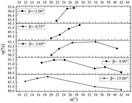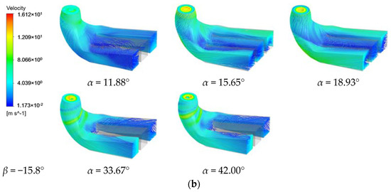 As shown in Figure 21, at a blade angle of 2°, the efficiency is only 82% when the opening is 21.69°, and the flow state of the draft tube is poor. When the opening is increased to 25.07°, the efficiency is increased to 92.3%, and the draft tube streamline is smooth. At a blade angle of −0.55°, the efficiency increases with the increase in the opening. At a blade angle of −3.6°, the efficiency of each calculated opening is greater than 90.2%. At a blade angle of −9°, the efficiency exceeds 91.4% in the opening range of 17.04° to 24.26°, and the efficiency is as low as 86.7% when the opening is increased to 33.67°. At a blade angle of −15.8°, the efficiency of the five openings is lower than 85.3%.
