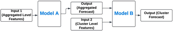 In our prior research [26], a two-stage methodology was assessed for forecasting load consumption within the residential hierarchy. This approach, comparable to the TD method, comprises two neural models trained separately. The first model, labeled as model A, is trained to predict load consumption at the aggregated level using only aggregated-level input features. Meanwhile, model B is tasked with forecasting load consumption at the cluster level, utilizing both its distinct features and the output of Model A. Illustrated in Figure 3 is a block diagram depicting the previously proposed two-stage model approach, showcasing the two neural network-based models. This methodology entailed training two models independently for each cluster forecast, and when compared to the BU approach, the methodology exhibited reduced error. The outcomes of the two-stage model approach demonstrated considerable potential in enhancing forecasting accuracy through the TD method, but the model in [26] did not consider any cross-learning features. Besides, the necessity of training two distinct models prompted the development of an end-to-end learning model, including cross-learning features, as elucidated in this paper.