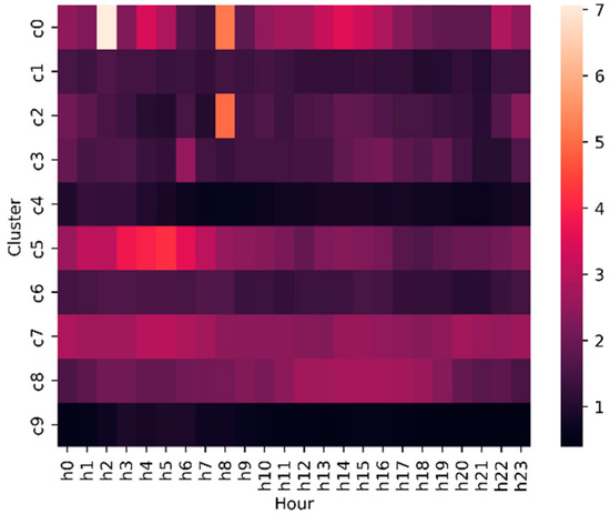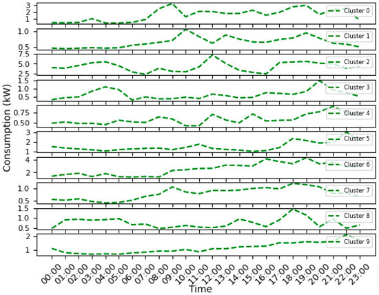 In a nutshell, the analysis revealed that the optimal grouping for the selected 50 houses consists of 10 clusters with the validation of each cluster’s quality determined by its Index of Agreement [26,47]. In Figure 6, we present the 24 h load profiles for these 10 clusters. The load profiles shown are the average of all the houses in that cluster. Each cluster showcases a distinct profile, characterized by differences in both the temporal alignment and magnitude. Each cluster exhibits a distinct pattern of energy usage throughout the day. Each cluster displays a unique energy consumption pattern throughout the day. Cluster 0 exhibits relatively consistent energy usage with minor fluctuations. In contrast, clusters 1, 3, and 8 demonstrate notable increases in energy usage at specific times. On average, cluster 1 experiences peak usage in the morning around 8 a.m., followed by a secondary peak in the evening around 6 p.m. Meanwhile, cluster 3 shows two peak utilization periods, with the first occurring in the early hours around 4 to 5 a.m. and the second in the evening close to 8 p.m. Cluster 8 maintains stable consumption levels from morning until 8 p.m., where the peak occurs. Clusters 2, 4, and 6 exhibit less variability in consumption, with cluster 2 showing a significant peak in the late morning, between 11 a.m. and 12 p.m. Cluster 6 has low but steady energy consumption during the night at 8 a.m., after which the consumption stays steady with a higher magnitude. The remaining clusters, 7 and 9, demonstrate low energy usage throughout the day, with slight increases observed at certain times.