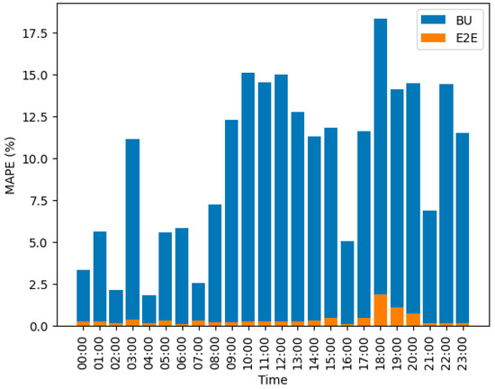 Figure 8 shows the comparison of the MAPE at the aggregated level for 24 h between the E2E model and BU approach. The proposed E2E model has a MAPE range of 0.08% to 1.85% in 24 h, while the BU approach has a range of 0.04% to 18.3%. The E2E model follows the actual values closely, while the BU approach deviates more. The E2E approach achieves high accuracy at the aggregated level because the TD approach is very precise at the aggregated level.