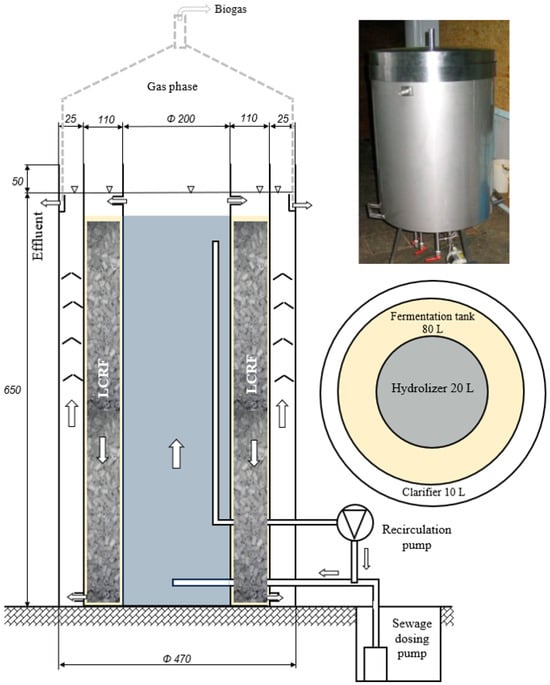 In this part of the VAL-FB, the anaerobic sludge grew in the form of a biofilm, and the flow of confectionery wastewater was descending (from top to bottom). Under the conditions of this section, metagenesis and the binding of phosphorus compounds took place. The wastewater was fermented in the external section, with an active volume of 10 L, and the sewage was fermented. Functionally, this section also served as an anaerobic sludge separator and settler, where sludge traps were used to clarify the CW by collecting, retaining, and sedimenting the anaerobic sludge. In this section, an upward flow (from bottom to top) was ensured, and the treated wastewater was discharged via an overflow outside the reactor. The VAL-FB was equipped with a gas-tight lid, which was sealed with a water seal. Stable temperature conditions of 35 ± 1 °C in the VAL-FB were ensured by the use of a water jacket. The hot water tank had a volume of 40 L, and the power of the electric heater was 2000 W. Hot water circulation in the system was ensured by a circulation pump with a capacity of 4 m3/h and automatic operation control based on temperature sensor readings. VAL-FB was insulated with a 50 mm thick layer of mineral wool. The confectionery wastewater was delivered daily and stored in a retention tank with an active volume of 200 L, which was equipped with a mixing system with a nozzle. The wastewater was pumped from the retention basin into the VAL-FB hydrolysis area using a submersible pump. The dosing pump was switched on 10 times per day. The VAL-FB diagram is shown in Figure 1.