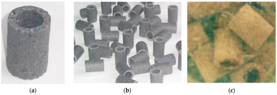The filling tested in the experiment was produced from waste from a company specialising in the recovery of metals from used wires and electrical appliances. After the metal recovery process, approximately 5% by weight of aluminium, 3% by weight of iron, and 2% by weight of copper remained in the shredded material. A detailed description of the process and the technological sequence of material recycling that led to the raw material for the production of LCRF was provided in a previous article [44]. A total of 80 L of VAL-FB were introduced into the methanogenesis section. The basic properties and strength parameters of the individual filling elements were as follows: active surface area, 500 m2/m3; height, 24 mm; outer diameter, 18 mm; inner diameter, 10 mm; bulk density, 300 kg/m3; mechanical fracture strength in the vertical axis, 3.2 N/mm2; mechanical fracture strength in the horizontal axis, 0.04 N/mm2. The filling elements are shown in Figure 2.
