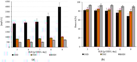 The influence of applied OLR using different reactors for the treatment of sugar and confectionery wastewater under anaerobic conditions has been described in the literature. Barrera et al. (2019) [48] used upflow UASB reactors to treat sugar cane wastewater at OLRs of 3.03, 5.66, 7.34, and 10.01 g COD/L∙d. The COD inflow ranged from 4320 to 12,690 mgO2/L. The COD removal efficiencies were 72.8%, 88.8%, 80.0%, and 78.0%, respectively [48]. Other researchers [49] treating sugar wastewater in UASB found that the COD removal efficiency ranged from 80.6 to 89.4 when the OLR was increased from 8 to 16 g COD/L∙d. Increasing the OLR to 24 g COD/L∙d led to a drastic decrease in COD removal efficiency to 53.3% [49].