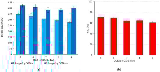 The efficiency of biogas production per COD load removed was similar when the OLR values tested ranged from 5.0 gCOD/L·d (S1) to 7.0 gCOD/L·d (S3) (Figure 4a). The observed values ranged from 345 ± 11 mL/gCODrem. (S1) to 308 ± 16 mL/gCODrem. (S3) (Figure 4a). After conversion to the introduced COD load, the biogas production efficiency ranged from 282 ± 13 mL/gCOD (S1) to 248 ± 20 mL/gCOD (S3). The observed variability in biogas productivity in these technological variants (S1–S3) was not statistically significant (p > 0.05). However, a significant difference was observed in the CH4 content in the gaseous products of anaerobic bacterial metabolism (p < 0.05). Monitoring the concentration of this biogas component showed that the highest CH4 concentration was observed in the range of OLR used, extending from 5.0 g COD/L·d (S1) to 6.0 g COD/L·d (S2). In these variants, 70.7 ± 2.3% and 69.6 ± 1.7% CH4 were found in the biogas (Figure 4b), which ensured a CH4 yield of 134 ± 4.6 L CH4/d and 153 ± 5.2 L CH4/d, respectively (Table 4). Based on the COD load introduced, the CH4 yield ranged from 244 ± 8.5 mL CH4/gCODin. (S1) to 230 ± 7.6 mL CH4/gCODin. (S2) (Table 4). The qualitative composition of the biogas changed significantly in the next two OLR stages tested (S3–S4) (p < 0.05). Very similar CH4 concentrations were obtained for these variants, which were 64.1 ± 1.2% (S3) and 64.2 ± 1.9% (S4) (Figure 4b). CH4 production was 151 ± 5.5 L CH4/d (197 ± 6.8 mL CH4/gCODin.) in S3 and 165 ± 6.3 L CH4/d (188 ± 6.5 mL CH4/gCODin.) in S4 (Table 4). A significantly lower CH4 content in the biogas of 60.7 ± 2.8% was observed in the variant with an OLR of 9.0 g COD/L·d (S5) (p < 0.05) (Figure 4b). Results of 166 ± 6.2 L CH4/d were obtained here, which corresponded to 168 ± 7.8 mL CH4/gCODin. (Table 4).