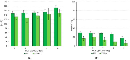 The concentration of nitrogen compounds in the raw wastewater fed to the VAL-FB was 210 ± 35 mg TN/L and 159 ± 27 mg N-NH4/L. In the range of OLR variants used, from 5.0 g COD/L·d (S1) to 8.0 g COD/L·d (S4), similar TN concentrations were found in the treated wastewater (p > 0.05). The observed values ranged from 147 ± 9 mg TN/L (S1) to 153 mg TN/L (S4) (p > 0.05) (Figure 5a). The treatment efficiencies were exhibited in a narrow range from 30.0 ± 3.1% (S1) to 27.1 ± 3.9% (S4) (p > 0.05) (Figure 5b). A statistically significant increase in effluent TN concentration of 172 ± 10 mg TN/L, with a removal efficiency of 8.1 ± 2.9%, was achieved when an OLR of 9.0 g COD/L·d was used (p < 0.05) (Figure 5). The observations of N-NH4 concentrations in raw and treated wastewater show that no significant differences in the concentration of this pollutant indicator were observed in the VAL-FB effluent, regardless of the OLR variant used (p > 0.05). The lowest value of 127 ± 21 mg N-NH4/L was found in S2, while the highest value was 149 ± 18 mg N-NH4/L in S5 (p > 0.05) (Figure 5a). The observed N-NH4 values in the treated wastewater were the result of the removal of this pollutant indicator, and they ranged from 20.1 ± 8.3% to 6.3 ± 6.0% (Figure 5b).