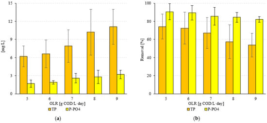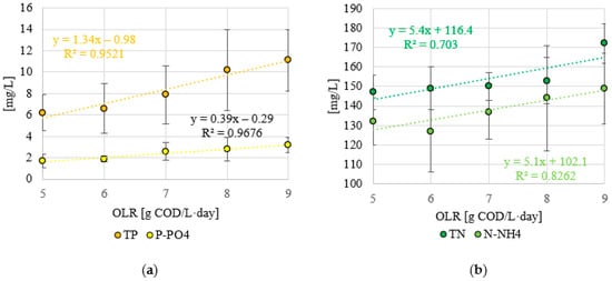(a) Correlations between the applied OLR and the concentration of nitrogen and (b) phosphorus compounds in the outflow.