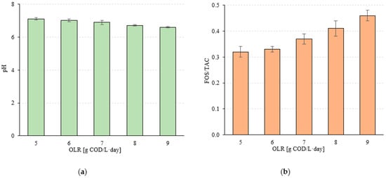 A stable pH was observed within the range of OLR values of 5.0 to 7.0 g COD/L·d (p > 0.05). The values of this indicator were within narrow limits of 7.12 ± 0.07 (S1) to 6.90 ± 0.12 (S3) (Figure 8a). A significant decrease to 6.72 ± 0.05 was observed in S4 (p < 0.05) and a further decrease to pH 6.61 ± 0.04 at an OLR of 9.0 g COD/L·d (p < 0.05) (Figure 8a). A similar trend was observed for the FOS/TAC ratio. Stable and low values of this parameter were measured in S1 and S2, which were 0.32 ± 0.02 and 0.33 ± 0.01, respectively (p > 0.05) (Figure 8b). Increasing the OLR to 7.0 g COD/L·d (S3) led directly to a significant increase in FOS/TAC, to a value of 0.37 ± 0.02 (p < 0.05) (Figure 8b). In the S4 and S5 variants, the FOS/TAC values increased above 0.40 and were 0.41 ± 0.03 and 0.46 ± 0.002, respectively (Figure 8b). Very strong correlations were observed between the OLR used and pH (negative with a coefficient of determination of R2 = 0.9905) (Figure 9a) and FOS/TAC (positive with R2 = 0.9614) (Figure 9b). Very strong positive correlations were found between pH and the amount of biogas and CH4 expressed as introduced COD (R2 > 0.95) (Figure 10a) and CH4 concentration (R2 = 8904) (Figure 10b). However, there was no correlation between pH and biogas production expressed as COD removed (Figure 10a). Similar coefficients of determination were obtained for the relationship between the FOS/TAC ratio and biogas and CH4 production per unit and CH4 concentration, but these were negative correlations (Figure 11).