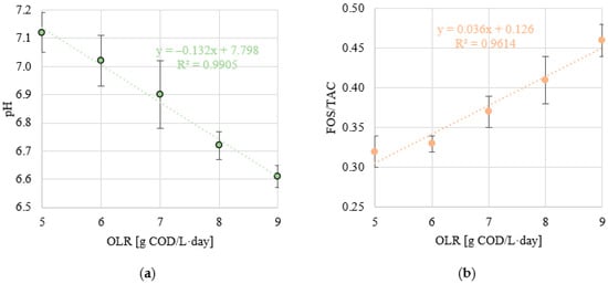 (a) Correlations between OLR and pH value and (b) OLR and FOS/TAC ratio.
