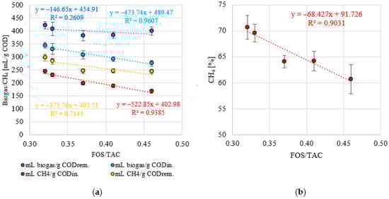 (a) Correlations between FOS/TAC and biogas and CH4 production and (b) between FOS/TAC and CH4 content in biogas.