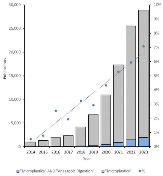 - Manu, M.K.; Luo, L.; Kumar, R.; Johnravindar, D.; Li, D.; Varjani, S.; Zhao, J.; Wong, J. A Review on Mechanistic Understanding of Microplastic Pollution on the Performance of Anaerobic Digestion. Environ. Pollut. 2023, 325, 121426. [Google Scholar] [CrossRef] [PubMed]