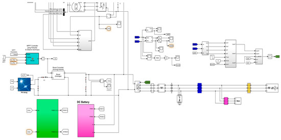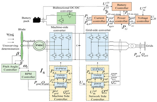 The integration of the energy storage system into a grid-side converter requires the use of a bi-directional DC–DC converter with a battery controller for the energy storage system in the middle and the dynamic regulation of active and reactive power by taking the limiting value of the power reference value , when it exceeds the limit value of the power suction and generation of the battery group; or represent the reference value of the active power of the power controller [25,26].