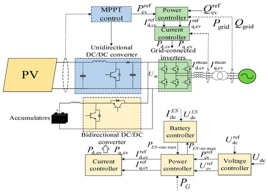 Figure 3 displays the photovoltaic storage configuration along with its control system. The MPPT controller of the PV control system provides the active power reference value of the grid-connected inverter, and the inverter’s reactive power reference value is configured based on the system’s power factor needs, and generally is set to 0. The power reference value is compared with the measured values and , and then the outer-loop power controller obtains the reference value and of the inner-loop current control in the synchronous coordinate system. The current control reference value and the measured values of the grid-side currents , are obtained from the current controller by means of the inverter trigger pulses , . Achieving the decoupling control of active and reactive power of inverters and synchronous grid connection can be performed by integrating phase-locked loop measurement methods [27,28,29,30]. The control approach for managing energy storage in photovoltaic systems aligns with the strategy used for controlling energy storage in wind power generation systems.