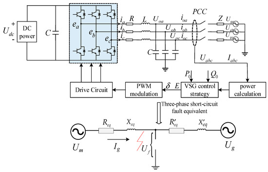 Virtual synchronous generator (VSG) technology replicates the functioning characteristics of a synchronous generator through the combination of conventional inverter hardware designs with VSG control methods. Figure 4 depicts the primary circuit structure of the VSG and the corresponding model during a three-phase short-circuit fault in the grid. The main circuit shown in the diagram includes the grid-connected inverter, the DC input power supply, and the line impedance. The controller is divided into two sections: the power frequency controller and the excitation controller. The DC input power supply outputs AC voltage after the inverter, and accesses the grid from the coupling point after the LC filtering line; its DC bus voltage is Udc; in the figure, L is the filtering inductance; C is the filtering capacitance; R is the filtering resistance; Z is the equivalent reactance of the grid line ea, eb, and ec for the three-phase inverter bridge arm voltage; Uoa, Uob, and Uoc for the three-phase inverter output terminal voltage; Uga, Ugb, and Ugc for the grid voltage; ia, ib, and ic for the current flowing through the filter inductor; ioa, iob, and ioc for the inverter output current.