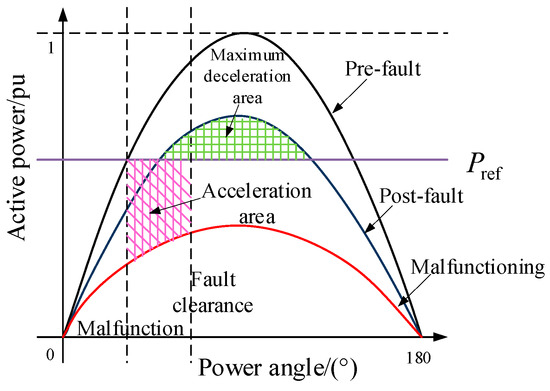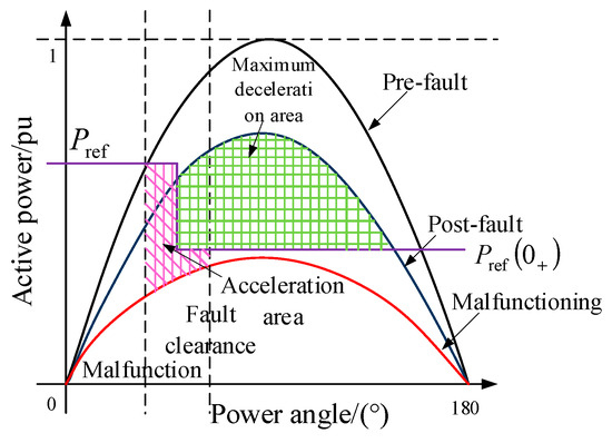 During a grid fault, the grid voltage decreases, and the output active power of the VSG decreases, which is less than the commanded value of the active power of the VSG (equivalent to the mechanical power of a conventional synchronous generator), and the resulting acceleration of the rotor during the transient process of the VSG leads to a rapid increase in its internal frequency and a corresponding increase in the power angle. According to the equal area law [16], when the acceleration area exceeds the maximum deceleration area, it can lead to the transient power angle stabilization issue. If the original power command of the VSG is still followed, the acceleration area and the maximum deceleration area of the VSG are as shown in Figure 5.