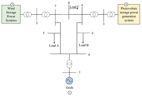 In this section, we validated the stability of wind power combined with energy storage during normal system operation and analyzed the effectiveness of the improved VSG control strategy during LVRT. The example is based on the IEEE 3-machine 9-node system. The wind power and photovoltaic power generation systems are fed into the 220 kV booster station through the 20 kV MV network and are connected to the grid at seven and nine nodes, respectively; the main wiring of the example system is shown in Figure 7; the main parameters of the system are shown in Table 1, which is used in the simulation and analysis of the control strategy by MATLAB R2021a/Simulink; and the simulation diagram is shown in Figure 8.