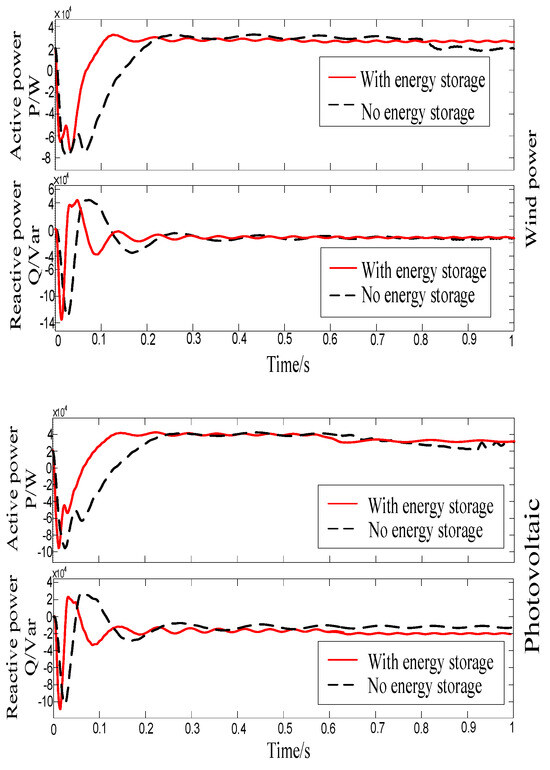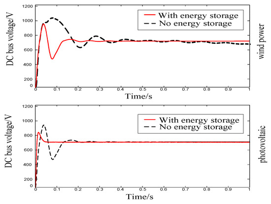 The PMD wind turbine, as depicted in Figure 9, utilizes the traditional four wind-speeds model. The initial active output of wind power is 25 kW, the initial active output of the photovoltaic is 30 kW, the energy storage station has a maximum charging/discharging power of 20 kW, the maximum power of energy storage is 300 kW·h, and the minimum power is 3 kW·h. In the simulation stage, its initial power is 18 kW·h, the charge/discharge efficiency is 0.87, and the discharge rate is 0.01. Figure 10 and Figure 11 display the DC bus voltage, as well as the comparison of active and reactive power waveforms of the wind power and photovoltaic power generation system with and without energy storage. This is performed to assess the impact of energy storage on the system during normal operation, and to evaluate its effectiveness in minimizing the effects of new energy inputs on the grid, as well as in regulating power generation from wind and solar sources.