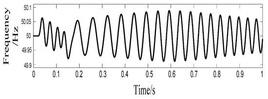 Due to the volatility of wind speed and light, the measured active power P as well as the DC bus voltage at the power station have strong fluctuations up to 12 kW (60%) and 400 V (53%) by 0.4 s, respectively. Under the same environmental conditions, after the energy storage section is integrated into the 750 V DC bus, the power station measures that the active power and reactive power do not fluctuate by more than 5 kW (25%) and 8 kVar (32%), respectively, with no obvious fluctuations in the overall situation, which is relatively smooth. It takes a shorter time to reach a stable output compared to the previous one, which is only 0.1 s, and the DC bus voltage fluctuation is not significant, with a value of around 750 V. The system net-side frequency is shown in Figure 12, and the fluctuation amplitude does not exceed 0.1 Hz keeping within the specified range, but the fluctuation frequency is large.