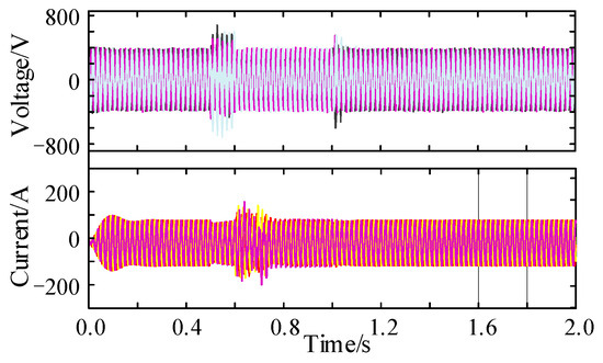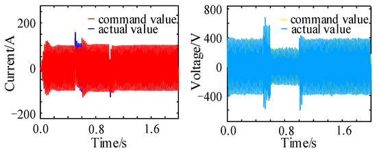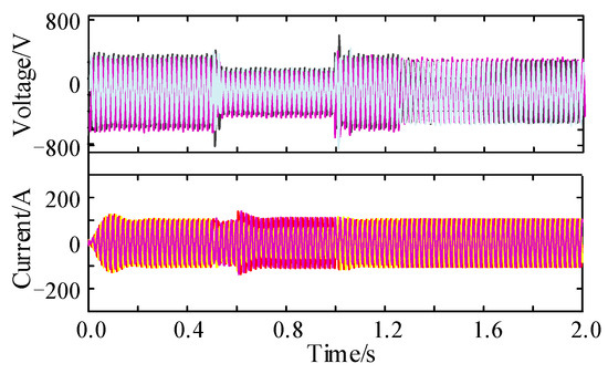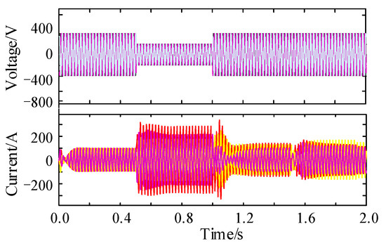 The inverter was designed to handle a steady-state current of 25 A (1.1 p.u.), a maximum inrush current of 30 A (1.3 p.u.), and a minimum reactive current injection of 15 A when the grid drops by 0.5 p.u. in compliance with the national standard. We conducted categorized simulation experiments on the grid-connected inverter’s output voltage and current in order to demonstrate its performance across the three modes of VSG, as shown in Figure 13, Figure 14 and Figure 15, In a symmetrical fault scenario, it is observed that the conventional VSG can produce a peak inrush current of up to 3 p.u., the VSG’s output current also rises to 350 A, exceeding its rated capacity significantly. Subsequently, the current starts oscillating and falling uncoordinated post-fault, failing to meet the low-voltage ride-through requirements. Setting the virtual impedance parameters to Rv = 7.4 and Lv = −1.8 mH enables VSG control of this mode to restrict fault current. As shown in Figure 14, the system experiences minimal fluctuations. However, during a fault event, the current exceeds the limit by 40 A, thus disrupting the system’s normal operation. In contrast, the improved VSG control utilizes a thorough current limiting approach by establishing the virtual impedance current at 8.1 A and the phase current limit at 7.8 A, with no changes in the virtual impedance setting. This approach improves the restraint on fault currents, minimizes variations in the output current amplitude, and maintains balanced currents across all three phases. Figure 16 illustrates the voltage and current waveforms at the grid side with the enhanced VSG operating under this control strategy during a symmetrical fault. The VSG dynamically follows the real-time voltage and current reference commands, ensuring that the reference values closely match the actual measurements, so as to uphold the VSG’s exceptional dynamic support capabilities.