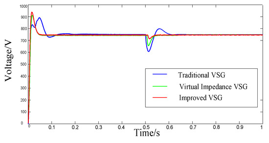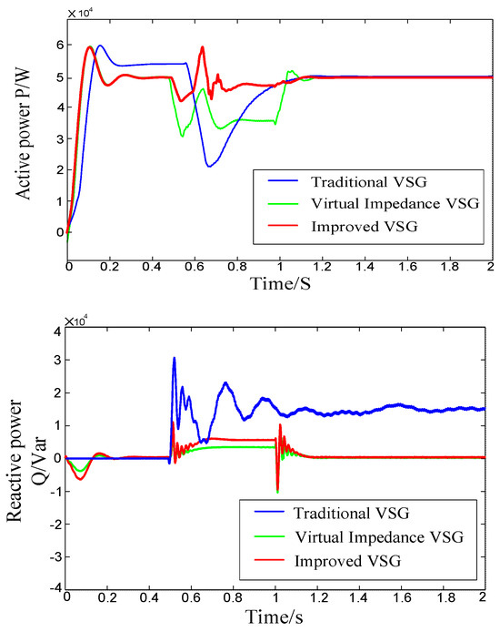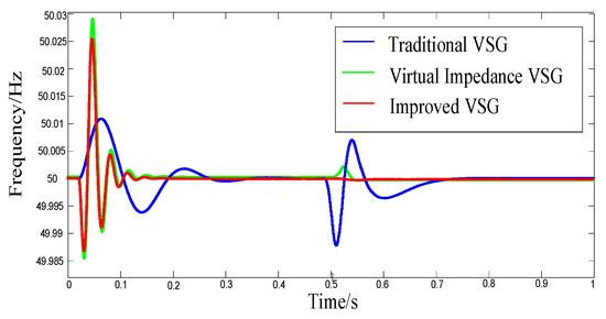 Figure 19 illustrates the impact of frequency control. The improved VSG control model demonstrates swift responsiveness to control commands, efficiently follows the system frequency variations, can deliver increased power support and load rapidly, which greatly enhances the frequency stability in the event of grid faults.