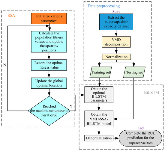 Flowchart of the RUL prediction method for supercapacitors based on VMD-SSA-BiLSTM.