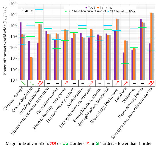 As Figure 2 shows, the choice of the sharing principle has a major influence on the sustainable level of each environmental impact. For example, for the French case, the sustainable limit for “climate change” is three times lower with the EVA-based indicator than with the current impact-based indicator. On the other hand, the difference between the two indicators is the opposite for the “land use” impact, with a factor of 100 between the two allocation methods. The BAU scenario is in fact one of the worst in terms of “climate change” and, on the contrary, one of the best in terms of “land use”, due to the predominance of gas for heat production. Consequently, even if the calculated sustainable level for “climate change” is lower than the current level, it leaves room for other technologies with a better impact on “climate change”—such as those developed in the Lo and Hi scenarios—to reach this threshold. However, given that the total impact of “land use” also needs to be reduced by a factor of 9.33, and that the BAU scenario’s impact for this category is already low, this leaves no room for other technologies for this impact category. This example shows that defining sustainability on the basis of current impacts imposes limits on future technologies based on current production systems. However, the environmental impacts of alternative energy solutions are very different from current ones and therefore not compatible with this choice. On the contrary, the EVA-based sharing principle distributes the “right to impact” among all sectors of activity, on the sole basis of the economic value of their production, irrespective of the current energy system used for this production. This choice avoids imposing constraints that are specific to the type of energy initially installed, so as not to exceed the environmental impacts that are already the lowest for the current production system.