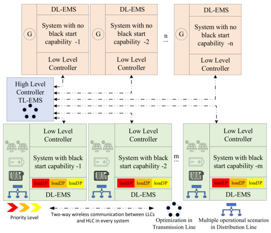 The proposed energy management system employs a multi-level control strategy across the power system. It utilises a hierarchical structure with DL-EMS and TL-EMS to efficiently manage energy within the areas of the power system and maintain overall grid stability, particularly during normal scenarios and emergencies. It categorises areas based on their black start capabilities. Certain areas lack black start capability as they primarily use traditional steam-powered synchronous generators for energy production. These generators require the power grid to be operational in order to start up, limiting their ability to restart the system independently during a blackout. In contrast, areas with black start capability are characterised by their integration of renewable energy sources such as solar panels, batteries, and fuel cells. These distributed renewable energy resources can initiate the restoration of the grid independently, which enhances the overall resilience and sustainability of the power system. The dual layer of the proposed system, including both DL-EMS and TL-EMS under the hierarchical energy management system, significantly enhances operability and coordination. It ensures smooth communication and integrated control across all levels of the energy distribution network, addressing both normal operations and contingency scenarios effectively. The HLC and LLC engage in two-way communication, exchanging various types of information depending on different operational scenarios. Detailed explanations are provided in the following sections. The architecture and operational dynamics of this novel energy management system are depicted in Figure 1.