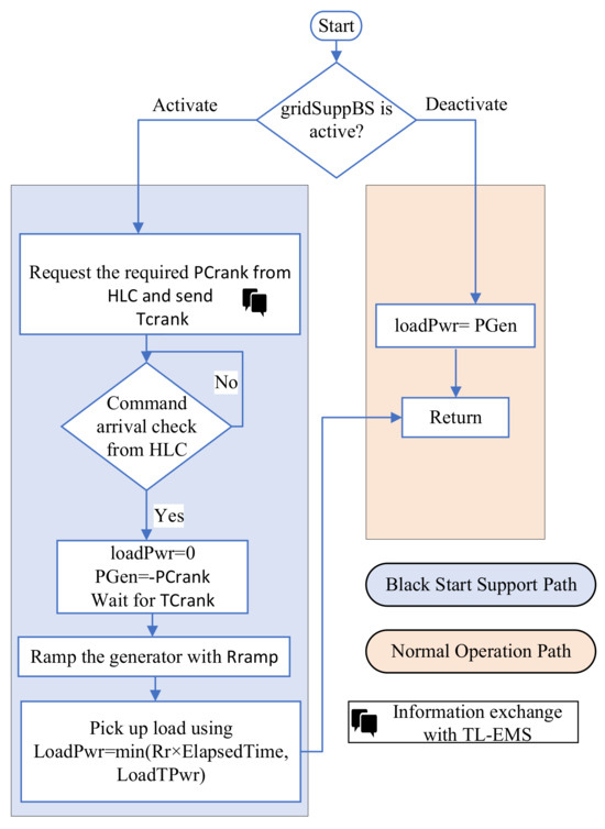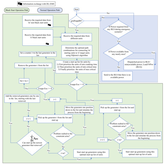 Flow chart of DL-EMS in black start-capable areas (BSAs): detailing the paths for normal operation and black start support.