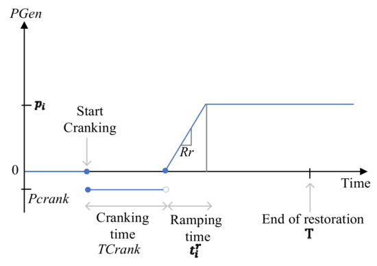As previously indicated, NBSAs are traditionally equipped with a single synchronous generator for simplicity. There are two primary operational scenarios for these areas, as shown in Figure 2, which are the black start support path and the normal operation path. Under normal operation, the generator power (PGen) is adjusted to meet load demand power (loadPwr) using its governor system to achieve a balance between the load and generation, and system stability is maintained. However, the inherent challenge with synchronous generators is their dependency on an external electricity supply to start up during black start conditions. This necessity is graphically represented in Figure 3, where the generation capability curve indicates that the generator must be supplied with a specific cranking power () for a defined period, known as the cranking time (), to begin starting up. After this period, the generator has the capacity to produce power, but its output increases gradually in accordance with the ramp rate (). Accordingly, loads within the NBSA are incrementally reintroduced to service as the generator progresses along the ramping curve, incrementally generating more power. This sequence continues until all the loads in the area have been reconnected. At this point, the generator is considered to have successfully started up and transitions to the normal operation path. Moreover, the LLC of NBSAs necessitates communication with the HLC at the transmission level. This involves transmitting not only the required power and cranking time but also two critical parameters: the minimum critical time (Tgcmin) and the maximum critical time (Tgcmax). These parameters indicate the timeframe within which the generator must be cranked. If an NBSA does not start within the corresponding maximum critical time, the unit will become unavailable after a considerable time delay. Furthermore, an NBSA with the minimum critical time is not ready to receive cranking power until after this time. Thus, the HLC optimally allocates this cranking power from the nearest BSA within these timeframe constraints. Upon receiving the command about the availability of the cranking power from the HLC, the generator in the NBSA begins to crank and moves to operational status.